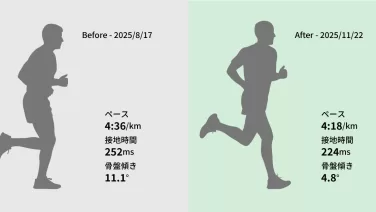 キロ4:15では「根性走」だった。データ分析とシューズの選び替えで、骨盤主導の効率的なフォームへ。3日間で骨盤回転タイミングが30.2→48.05に改善。ランメトリクスが見つけた「非効率の正体」とは?