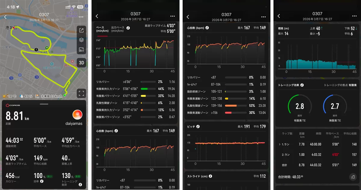 COROSアプリはスクロールで一気に確認できます。ペース・心拍・ピッチが縦に並んでいて、下にスクロールすれば全データが流れてくる。