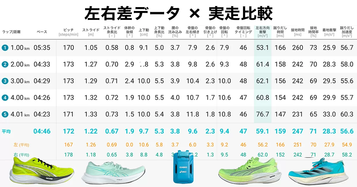 分かったこと:速いペースになると左右差が顕著に拡大すること、そしてシューズによって左右差の出方が大きく異なることが判明しました。